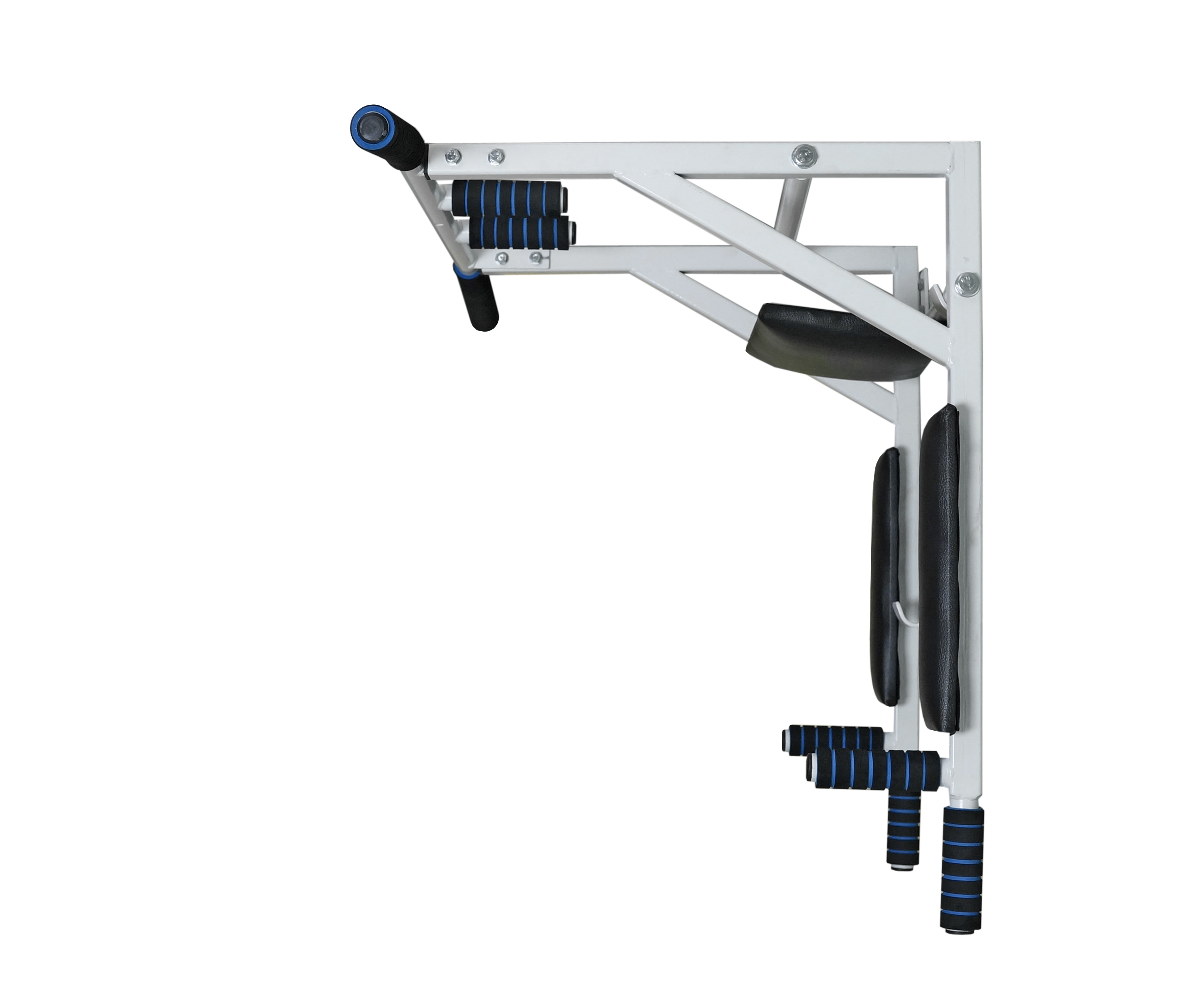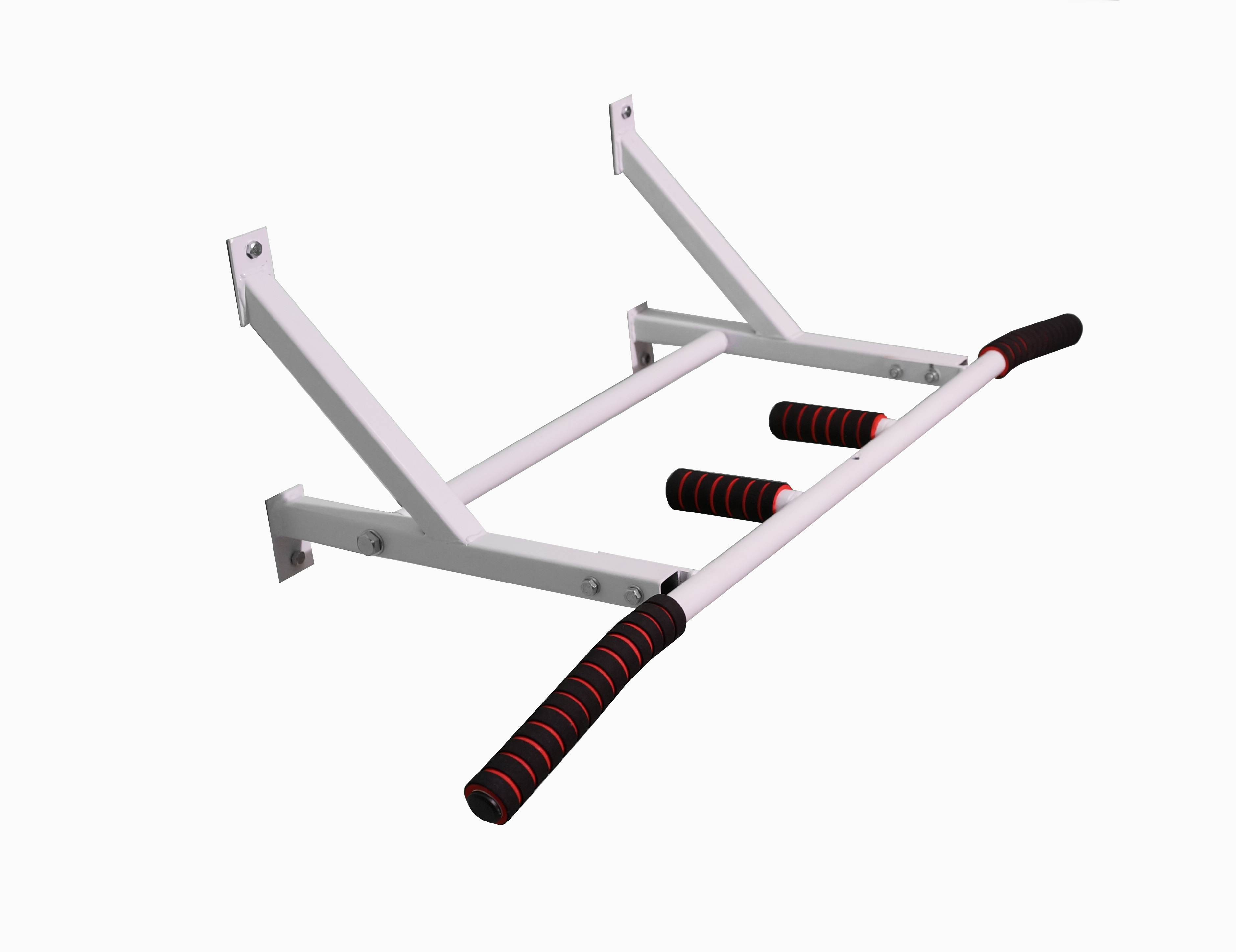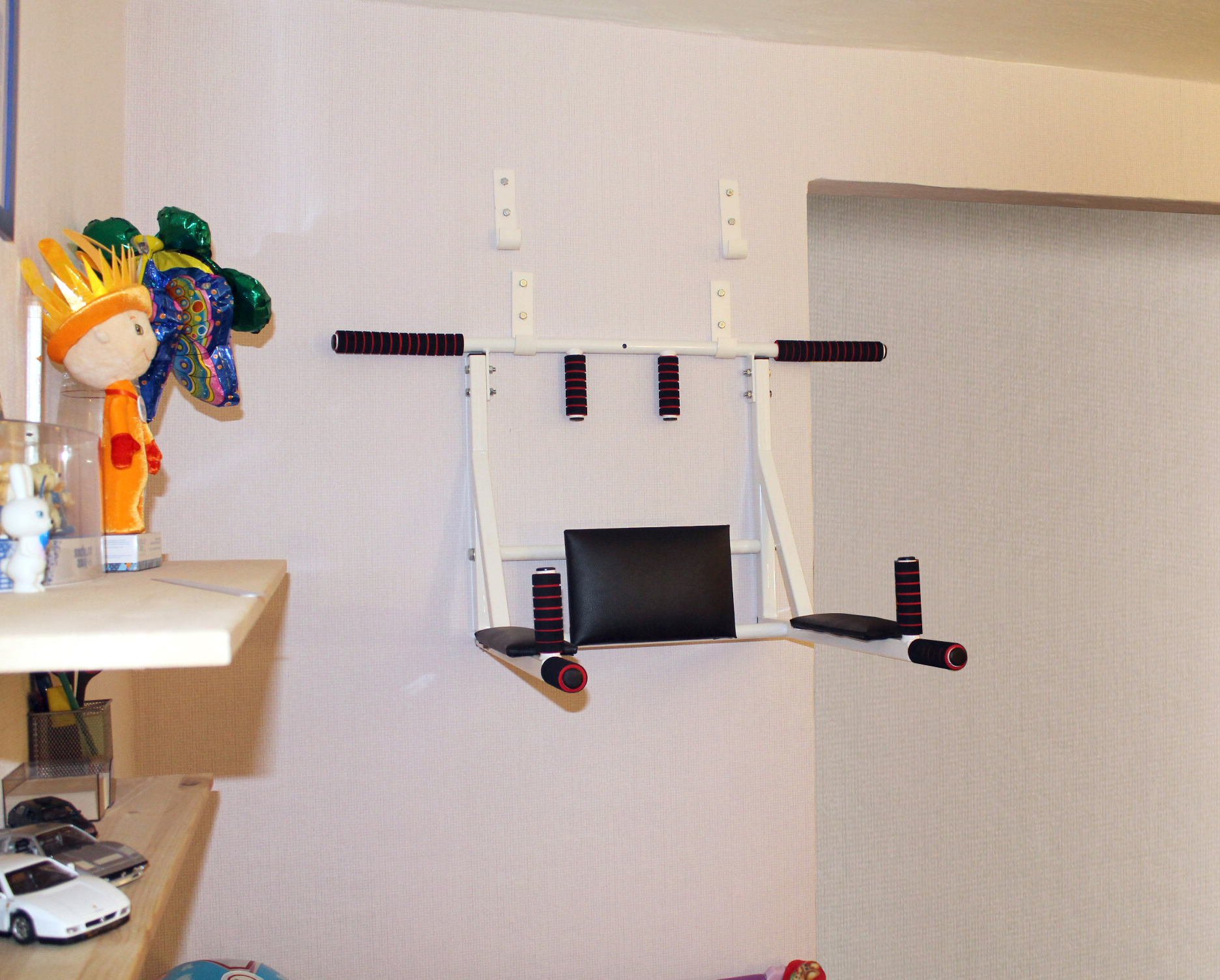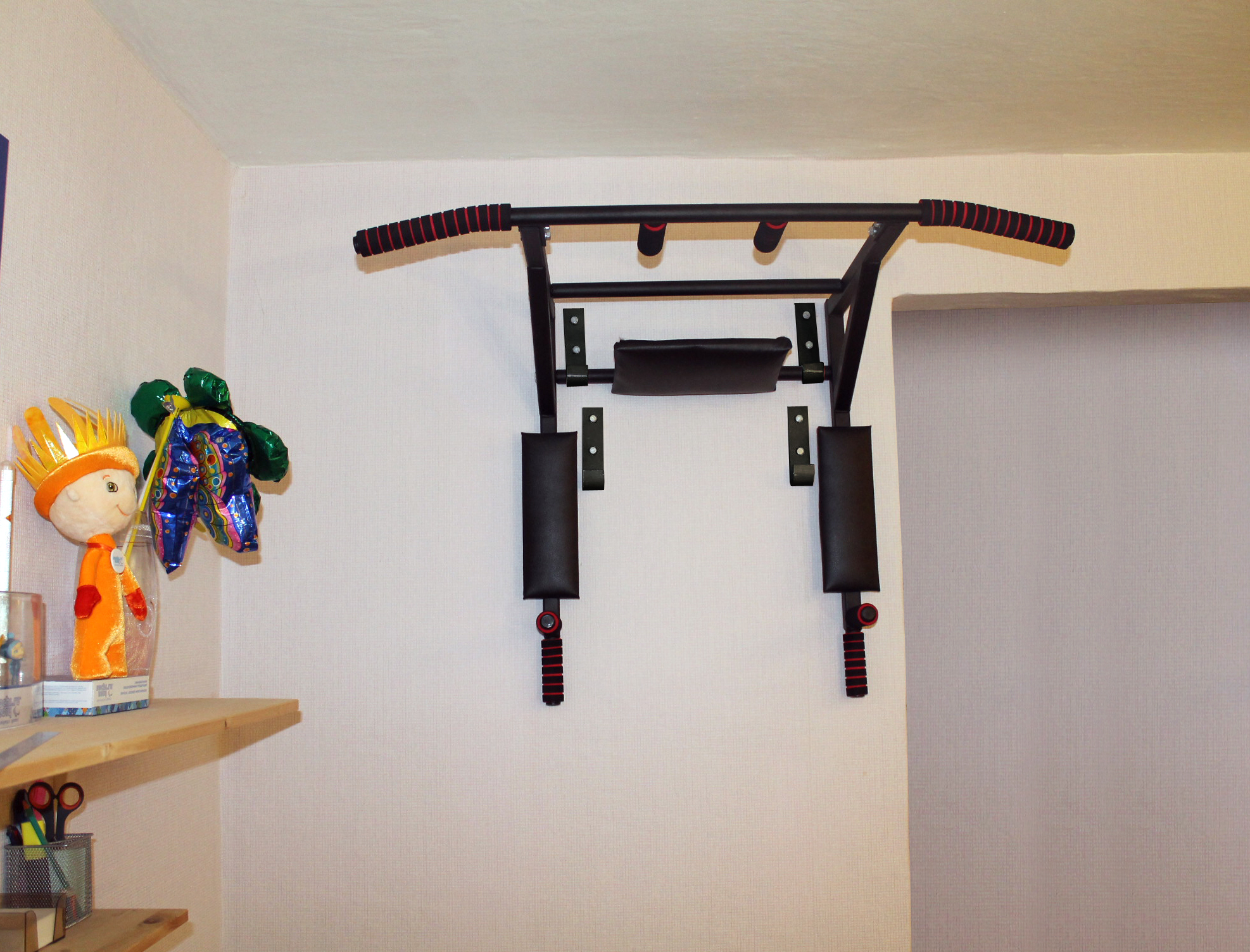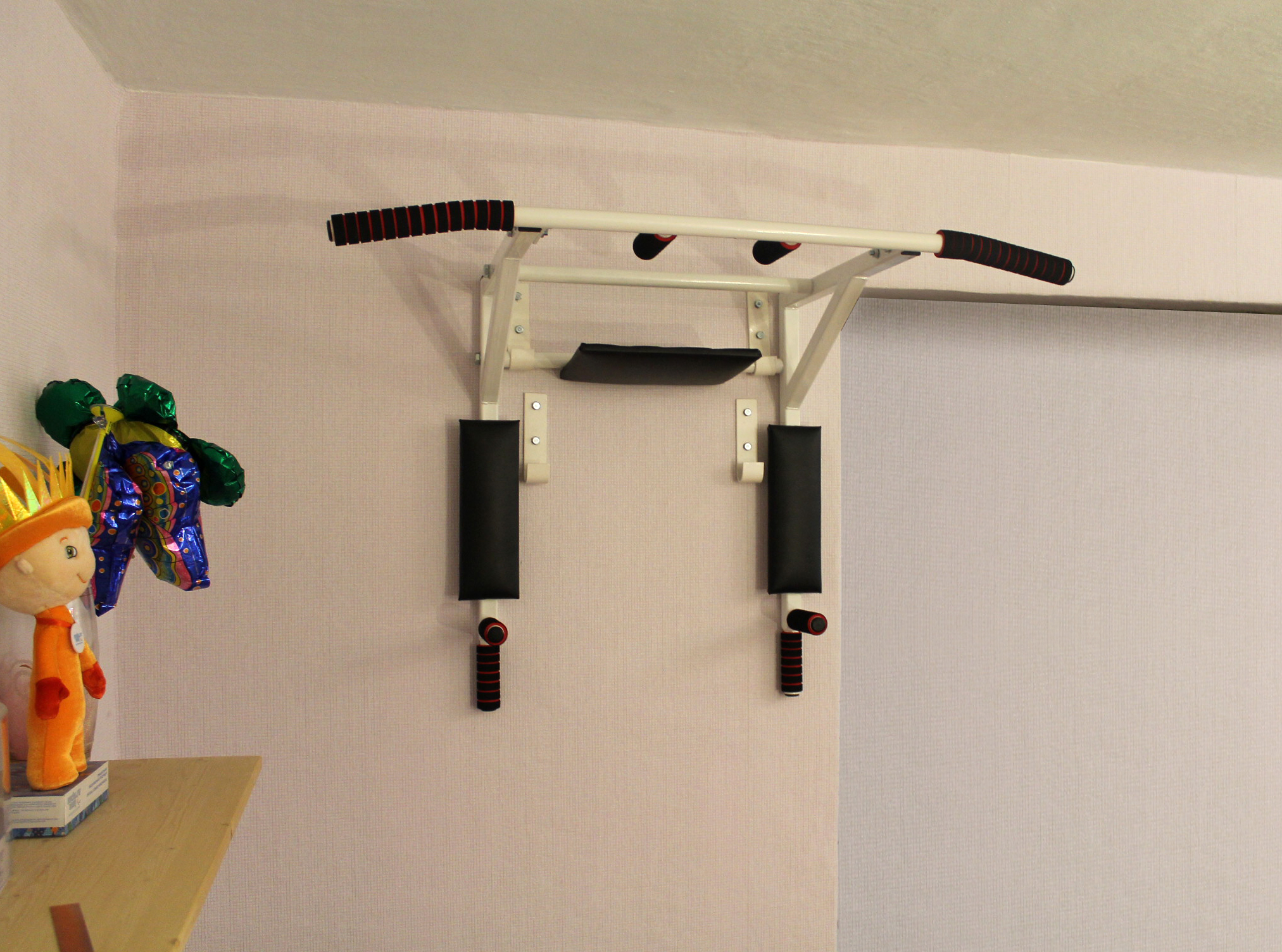 Турник имеет форму "Г". Таким образом получается, что он идёт по стене, а потом уже ближе к потолку в 30 см от него идёт параллельно потолку. И получается, что полезного пространства практически не занимает.